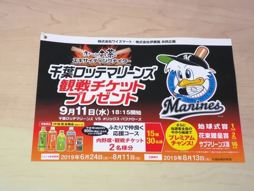 2019年6月24日(月)から、ワイズマートと伊藤園のタイアップで行われているキャンペーン「お~いお茶 千葉ロッテマリーンズ観戦チケットプレゼント」をご紹介します。 ワイズマート×伊藤園 お~いお茶 千葉ロッテマリーンズ観戦チケットプレゼント 【賞品】 …