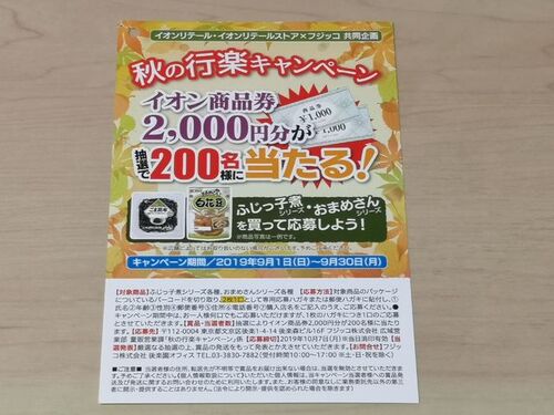 イオンとフジッコのタイアップで行われている『秋の行楽キャンペーン』をご紹介! イオン×フジッコ 秋の行楽キャンペーン 【賞品】 イオン商品券2,000円分×200名 【キャンペーン期間】 2019年9月1日(日)~9月30日(月) 【応募締切】 2019年10月7日(月) 【対象…