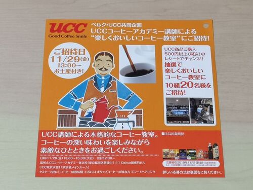 ベルクとUCC上島珈琲のタイアップで行われているキャンペーン『UCCコーヒーアカデミー講師による“楽しくおいしいコーヒー教室”にご招待!』をご紹介! ベルク×UCC上島珈琲 コーヒー教室ご招待キャンペーン 【賞品】 UCCコーヒーアカデミー講師による“楽しく…
