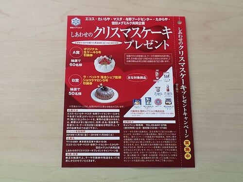 埼玉県・茨城県を中心に関東で展開しているスーパーのエコスで行われているキャンペーンをご紹介! エコスグループ×雪印メグミルク しあわせのクリスマスケーキプレゼント A賞:オリジナル生ケーキ5号引換券×60名 B賞:ラ・ベットラ 落合シェフ監修 ショコ…