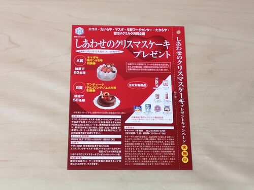 埼玉県・茨城県を中心に関東で展開しているスーパーのエコスで見つけた懸賞ハガキです。 エコスグループ×雪印メグミルク しあわせのクリスマスケーキプレゼントキャンペーン A賞:ヤマザキ 苺サンド5号引換券×60名 B賞:アンティーク チョコリング・ノエル…