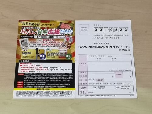 埼玉県・群馬県を中心に関東で展開するスーパーのベルクで見つけた懸賞ハガキです。 ベルク×アイリスフーズ おいしい食卓応援プレゼントキャンペーン A賞:低温調理器LTC-01×100名 B賞:アイリスの生鮮米 五銘柄食べ比べ×100名 レシート有効期間:2020年11…