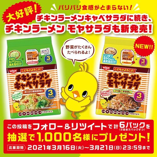 チキンラーメン ひよこちゃん公式Twitterアカウントで行われている『チキンラーメンサラダ フォロー&RTキャンペーン』をご紹介! チキンラーメンサラダ フォロー&RTキャンペーン 出典:チキンラーメン ひよこちゃん (@nissin_hiyoko) | Twitter 【賞品】 …