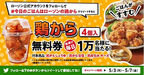 ローソンの公式Twitterアカウントで行われている『#今日のごはんはローソンの鶏から !Twitterキャンペーン』をご紹介! #今日のごはんはローソンの鶏から !Twitterキャンペーン 出典:ローソン (@akiko_lawson) | Twitter 【賞品】 鶏から4個 しょうゆ/旨…