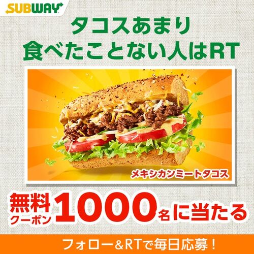 サブウェイの公式Twitterアカウントで行われている『タコス食べてみてフォロー&RT キャンペーン』をご紹介! タコス食べてみてフォロー&RT キャンペーン 出典:サブウェイ (@subwayjp) | Twitter 【賞品】 「メキシカンミートタコス」無料クーポン×1,000名…
