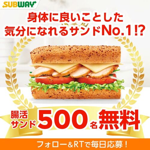 サブウェイの公式Twitterアカウントで行われている『腸活サンドフォロー&RT キャンペーン』をご紹介! 腸活サンドフォロー&RT キャンペーン 出典:サブウェイ (@subwayjp) | Twitter 【賞品】 「腸活サンドチキン and チーズ」無料クーポン×500名 【キャン…