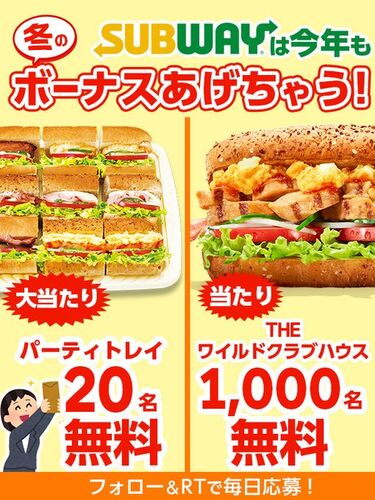 サブウェイ公式Twitterアカウントで行われている『冬のボーナスフォロー&RT キャンペーン』をご紹介! 冬のボーナスフォロー&RT キャンペーン 画像出典:サブウェイ (@subwayjp) | Twitter 【賞品】 「THE ワイルドクラブハウス」無料クーポン×1,000名 「…