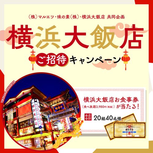 マルエツと味の素・大栄貿易公司のタイアップで行われている『横浜大飯店ご招待キャンペーン』をご紹介! マルエツ×味の素・大栄貿易公司 横浜大飯店ご招待キャンペーン 画像出典:マルエツ 応募サイト 【賞品】 横浜大飯店お食事券(食べ放題3,980円(税抜))×…