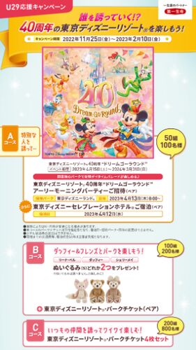 第一生命で行われている『U29応援!40周年の東京ディズニーリゾート®を楽しもう!キャンペーン』をご紹介! U29応援!40周年の東京ディズニーリゾート®を楽しもう!キャンペーン 画像出典:第一生命保険株式会社 【賞品】 Aコース:東京ディズニーリゾート®…