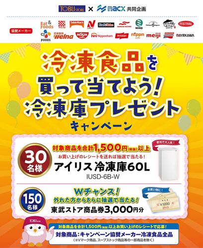 東武ストアで行われている『冷凍食品を買って当てよう!冷凍庫プレゼントキャンペーン』をご紹介! 東武ストア 冷凍食品を買って当てよう!冷凍庫プレゼントキャンペーン 画像出典:ようこそ東武ストアホームページへ 【賞品】 アイリス冷凍庫60L×30名 Wチャ…