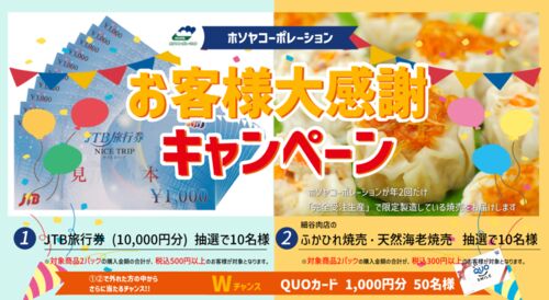 ホソヤコーポレーションで行われている『お客様大感謝キャンペーン』をご紹介! ホソヤコーポレーション お客様大感謝キャンペーン 画像出典:株式会社ホソヤコーポレーション 【賞品】 賞品①:JTB旅行券10,000円分×10名 賞品②:細谷肉店のふかひれ焼売・天…