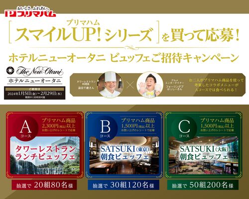 プリマハムで行われている『ホテルニューオータニ ビュッフェご招待キャンペーン』をご紹介! ホテルニューオータニ ビュッフェご招待キャンペーン 画像出典:プリマハム 【賞品】 Aコース:タワーレストラン ランチビュッフェ×20組80名 Bコース:SATSUKI…