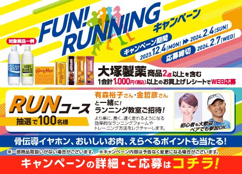 ウエルシアグループと大塚製薬のタイアップで行われている『FUN! RUNNINGキャンペーン』をご紹介! ウエルシアグループ×大塚製薬 FUN! RUNNINGキャンペーン 画像出典:ウエルシア薬局 【賞品】 〈RUNコース〉 ①:有森裕子さん・金哲彦さんと一緒に!ランニン…