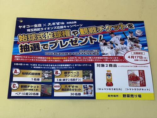 ヤオコーと久原醤油のタイアップで行われている『埼玉西武ライオンズ応援キャンペーン』をご紹介! ヤオコー×久原醤油 埼玉西武ライオンズ応援キャンペーン 【賞品】 A賞:始球式投球権×1名 B賞:親子ベースランニング×5組(親子2名ずつ) C賞:観戦チケッ…
