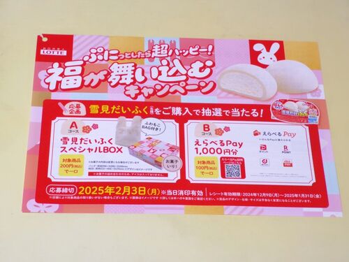ダイエーとロッテのタイアップで行われている『ぷにっとしたら超ハッピー!福が舞い込むキャンペーン』をご紹介! ダイエー×ロッテ ぷにっとしたら超ハッピー!福が舞い込むキャンペーン 【賞品】 Aコース:雪見だいふくスペシャルBOX(ふわもこBAG付き!)×5…