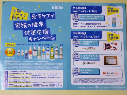 2025年1月6日(月)から、キリンビバレッジで行われる『受験シーズン到来!免疫ケアで家族の健康対策応援キャンペーン』をご紹介! 受験シーズン到来!免疫ケアで家族の健康対策応援キャンペーン 【賞品】 〈受験家族応援コース〉 3pt:キリン おいしい免疫ケ…