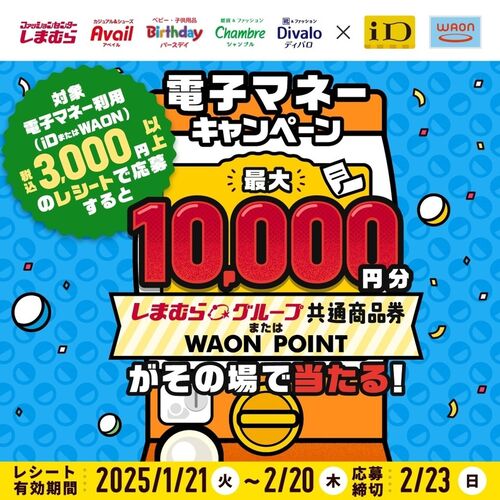 しまむらグループで行われている『電子マネーキャンペーン』をご紹介! しまむらグループ 電子マネーキャンペーン 画像出典:ファッションセンターしまむら 【賞品】 〈1等〉 しまむらグループ共通商品券10,000円分×60名 〈2等〉 iD:しまむらグループ共通商…