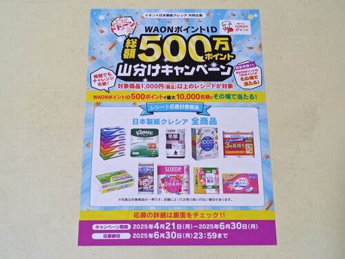 イオングループと日本製紙クレシアのタイアップで行われている『WAONポイントID総額500万ポイント山分けキャンペーン』をご紹介! イオングループ×日本製紙クレシア WAONポイントID総額500万ポイント山分けキャンペーン 【賞品】 WAONポイントID500ポイント×…