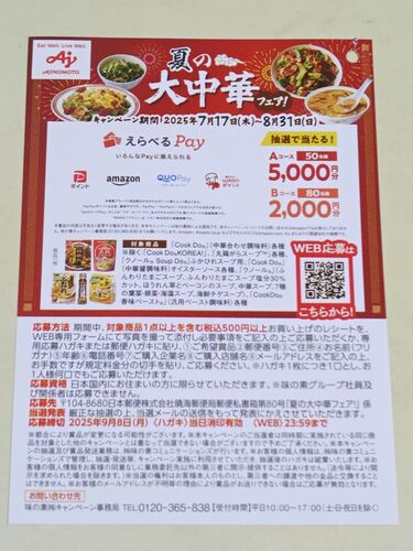 対象企業と味の素のタイアップで行われている『夏の大中華フェア!』をご紹介! 対象企業×味の素 夏の大中華フェア! 【賞品】 Aコース:えらべるPay 5,000円分×50名 Bコース:えらべるPay 2,000円分×80名 【レシート有効期間】 2025年7月17日(木)~8月31日(…