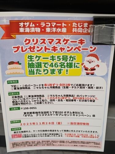 オザム・ラコマート・たじまと東海漬物・東洋水産のタイアップで行われている『クリスマスケーキプレゼントキャンペーン』をご紹介! オザム×ラコマート×たじま×東海漬物×東洋水産 クリスマスケーキプレゼントキャンペーン 【賞品】 クリスマスケーキ 生ケー…