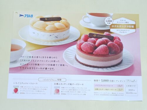 カスミとアヲハタのタイアップで行われている『ホテルオークラ特製オリジナルスイーツプレゼント』をご紹介! カスミ×アヲハタ ホテルオークラ特製オリジナルスイーツプレゼント 【賞品】 ホテルオークラ特製「白桃のショートケーキ」×65名 【応募締切】 202…