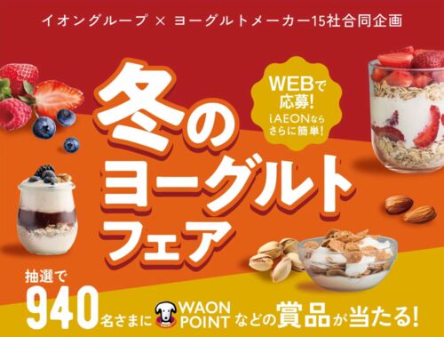 イオングループとヨーグルトメーカー15社のタイアップで行われている『冬のヨーグルトフェア』をご紹介! イオングループ×ヨーグルトメーカー15社 冬のヨーグルトフェア 画像出典:いいことナビ 【賞品】 A賞:5,000 WAON POINT または商品券5,000円分×800名…