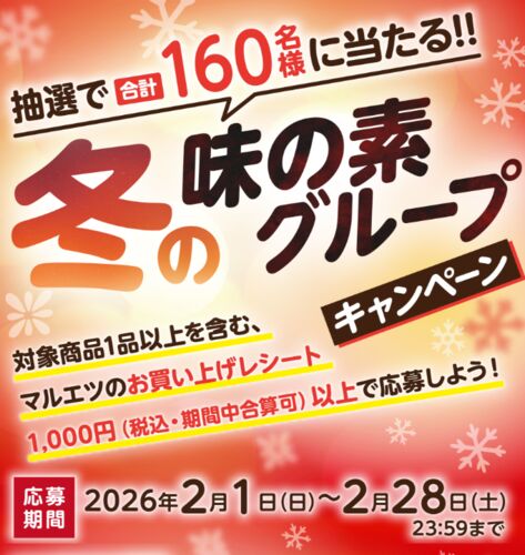 マルエツと味の素グループのタイアップで行われている『冬の味の素グループキャンペーン』をご紹介! マルエツ 冬の味の素グループキャンペーン 画像出典:冬の味の素グループキャンペーン | マルエツ 【賞品】 マルエツ商品券3,000円分×80名 Wチャンス:味…
