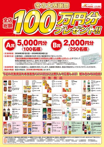 リブレ京成で行われている『冬の大感謝祭 商品券総額100万円プレゼントキャンペーン』をご紹介! リブレ京成 冬の大感謝祭 商品券総額100万円プレゼントキャンペーン 画像出典:スーパーマーケット リブレ京成 【賞品】 A賞:リブレ京成商品券5,000円分×100…