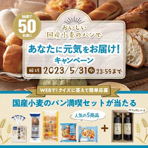 敷島製パンで行われている『おいしい国産小麦のパンであなたに元気をお届けキャンペーン!』をご紹介! おいしい国産小麦のパンであなたに元気をお届けキャンペーン! 画像出典:Pasco | 超熟のPasco | 敷島製パン株式会社 【賞品】 国産小麦のパン満喫セ…