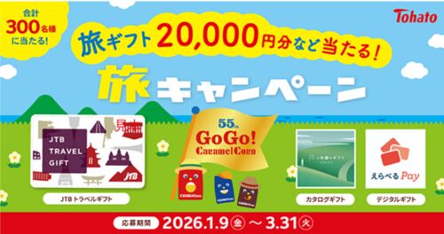 東ハトで行われる『55th GOGO! Caramel Corn 旅キャンペーン』をご紹介! 55th GOGO! Caramel Corn 旅キャンペーン 画像出典:東ハト 【賞品】 A賞(対象商品7個購入で応募):JTB トラベルギフト 20,000円分×50名 B賞(対象商品5個購入で応募):旅と体験のカ…