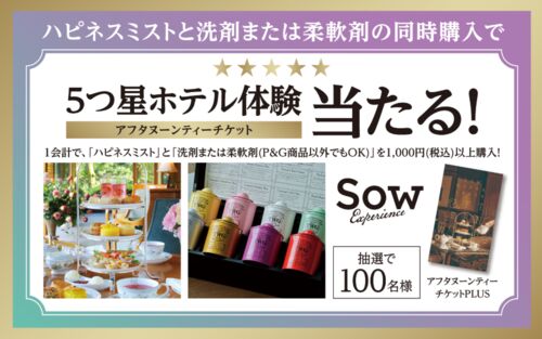 P&Gで行われている『ハピネスミスト 5つ星ホテル体験当たる!キャンペーン』をご紹介! ハピネスミスト 5つ星ホテル体験当たる!キャンペーン 画像出典:マイレピ | おトクなお買い物情報と暮らしに役立つ生活のレシピ 【賞品】 SOW EXPERIENCE「アフタヌー…