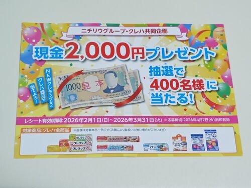 エコスグループとクレハのタイアップで行われている『ニチリウグループ×クレハ共同企画 現金2,000円プレゼント』をご紹介! エコスグループ ニチリウグループ×クレハ共同企画 現金2,000円プレゼント 【賞品】 現金2,000円×400名 【レシート有効期間】 2026年…