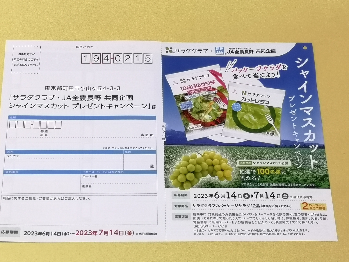 サラダクラブ対象商品のバーコードを2点数分を1口として、郵送で応募。