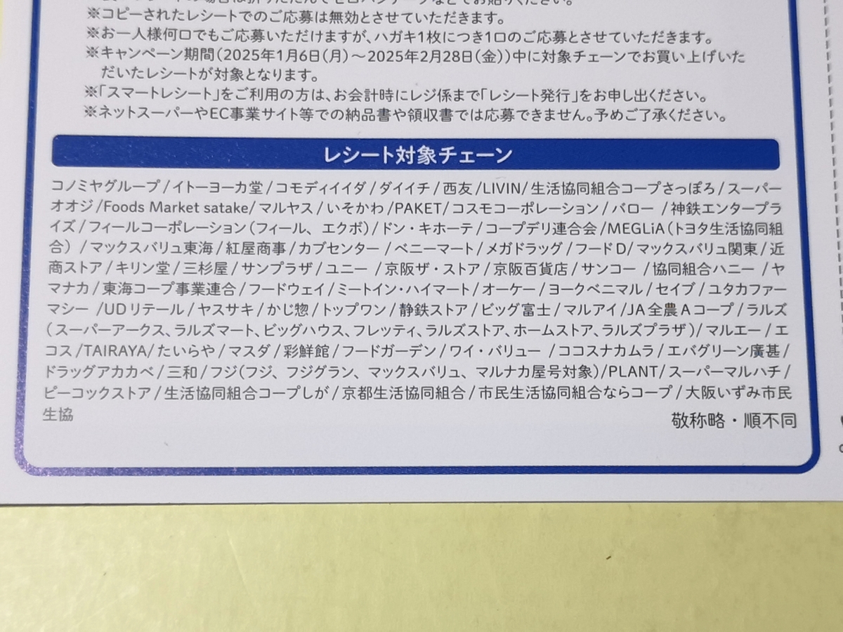 このブログの範囲だと、イトーヨーカドー、コモディイイダ、西友、ドン・キホーテ、コープみらい、マックスバリュ関東、エコスが対象ですね。
