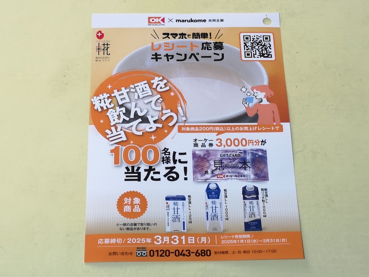 オーケーとマルコメのタイアップで行われている『糀甘酒を飲んで当てよう!スマホで簡単レシート応募キャンペーン』をご紹介!