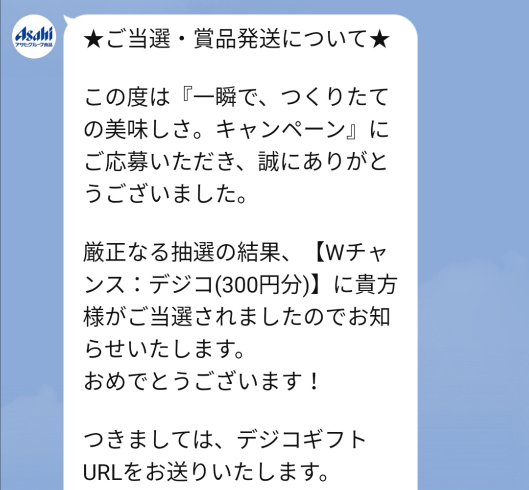 2025-01-31 【当選報告】アサヒグループ食品 一瞬で、つくりたての美味しさ。キャンペーン 当選報告 昨日、アサヒグループ食品で行われていた『一瞬で、つくりたての美味しさ。キャンペーン』のWチャンスに当選しました。 【当選報告】アマノフーズ 一瞬で、つくりたての美味しさ。キャンペーン Wチャンスのデジコ300円分です。 メモ 2口の応募で当選しました。
