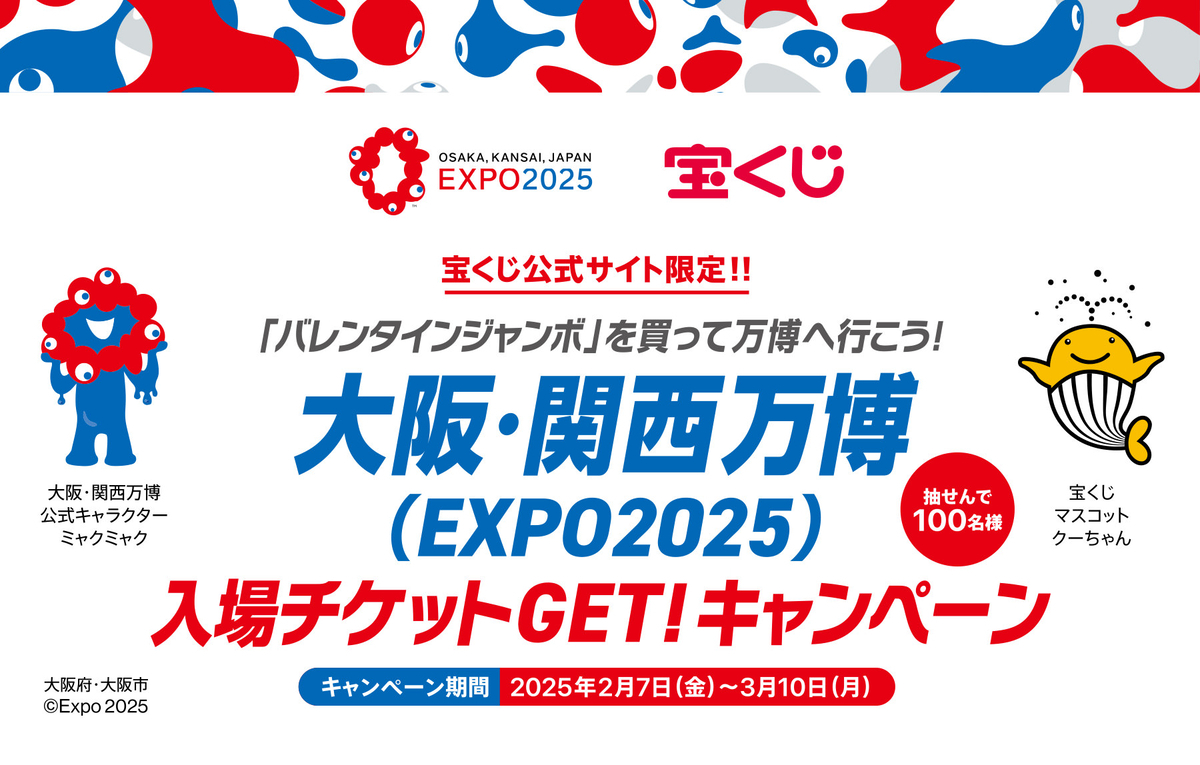 宝くじ公式サイトで行われている『「バレンタインジャンボ」を買って万博へ行こう!大阪・関西万博(EXPO2025)入場チケットGET!キャンペーン』をご紹介!