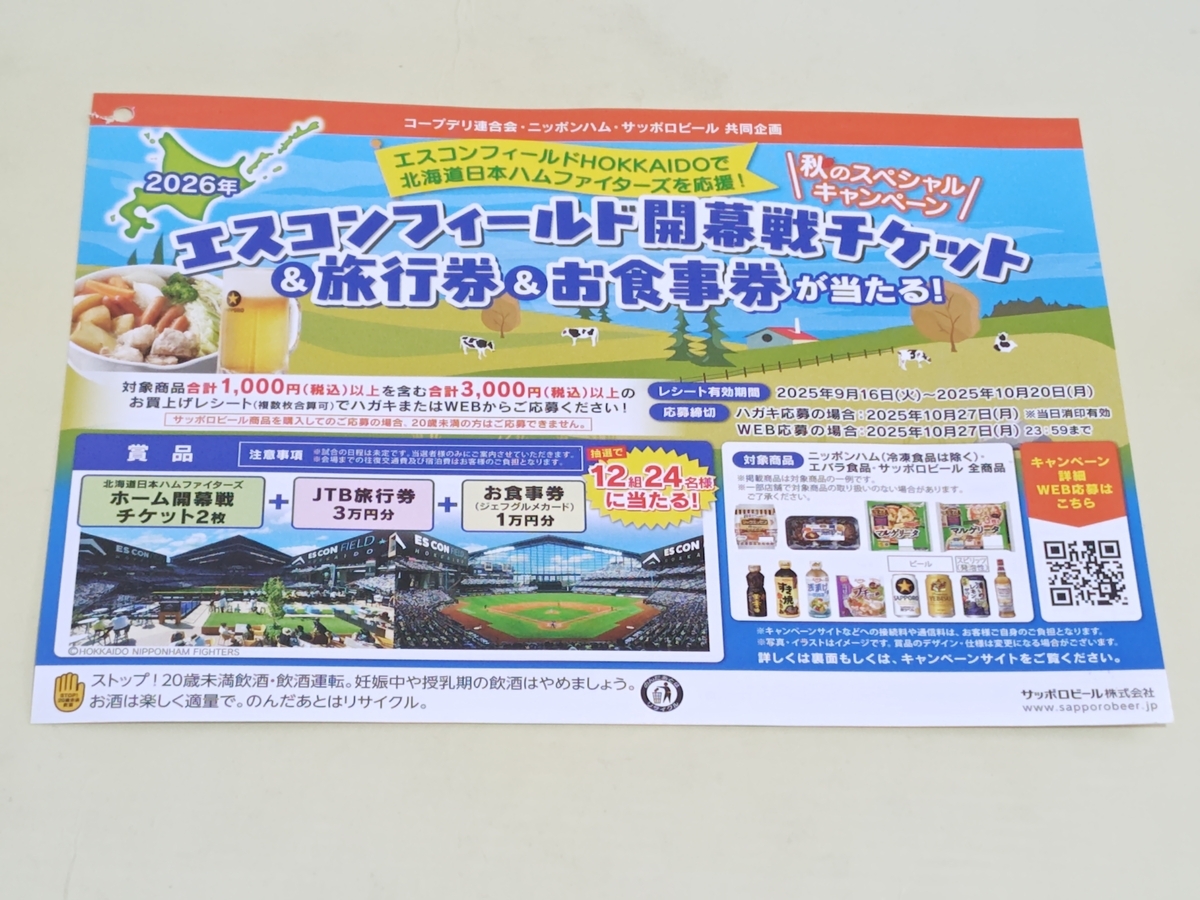 コープデリと日本ハム・エバラ食品工業・サッポロビールのタイアップで行われている『秋のスペシャルキャンペーン 2026年エスコンフィールド開幕戦チケット&旅行券&お食事券が当たる!』をご紹介!