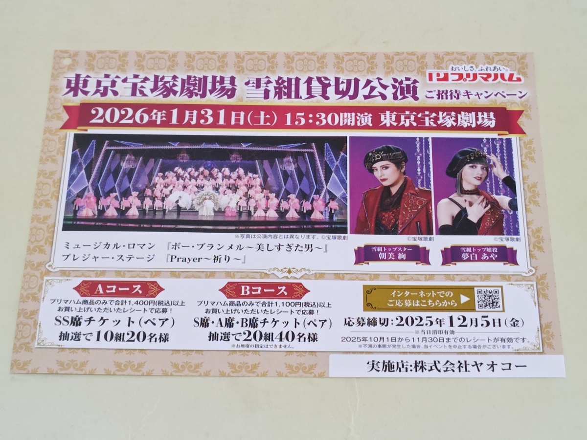 締切間近ですが、ヤオコーとプリマハムのタイアップで行われている『東京宝塚劇場 雪組貸切公演 ご招待キャンペーン』をご紹介。