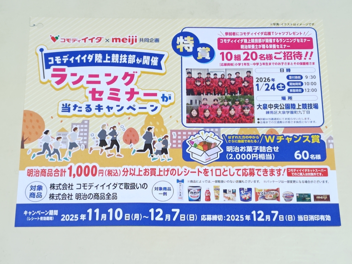 コモディイイダと明治のタイアップで行われている『コモディイイダ陸上競技部が開催 ランニングセミナーが当たるキャンペーン』をご紹介!