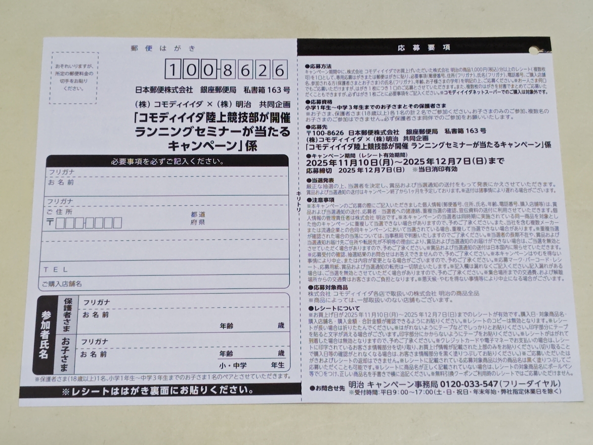 特賞:コモディイイダ陸上競技部が開催するランニングセミナー 明治栄養士が贈る栄養セミナー×10組20名(小学1年生~中学3年生までのお子さまとその保護者)