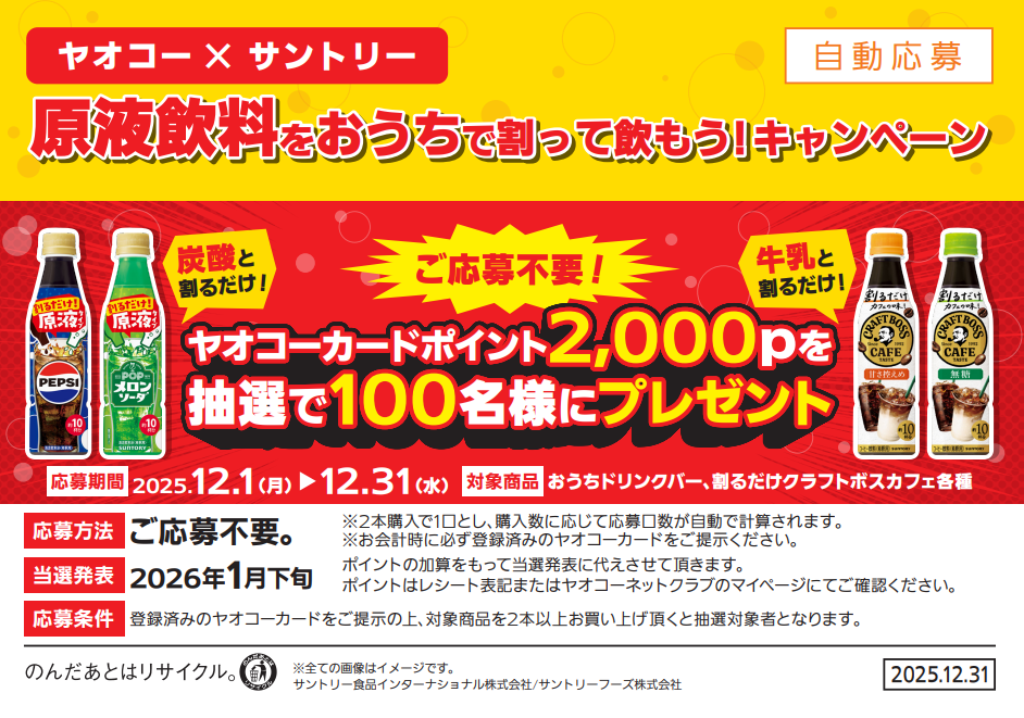 ヤオコーにて、ヤオコーカードをご提示のうえ、サントリー対象商品を2本購入ごとを1口として自動エントリー。
