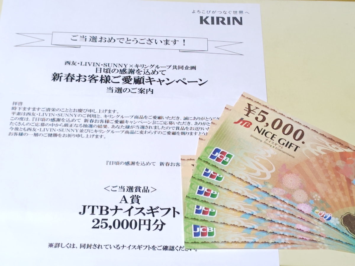 今年1番の大物当選は、西友とキリングループのキャンペーンで当たったJTBナイスギフト25,000円分でした。